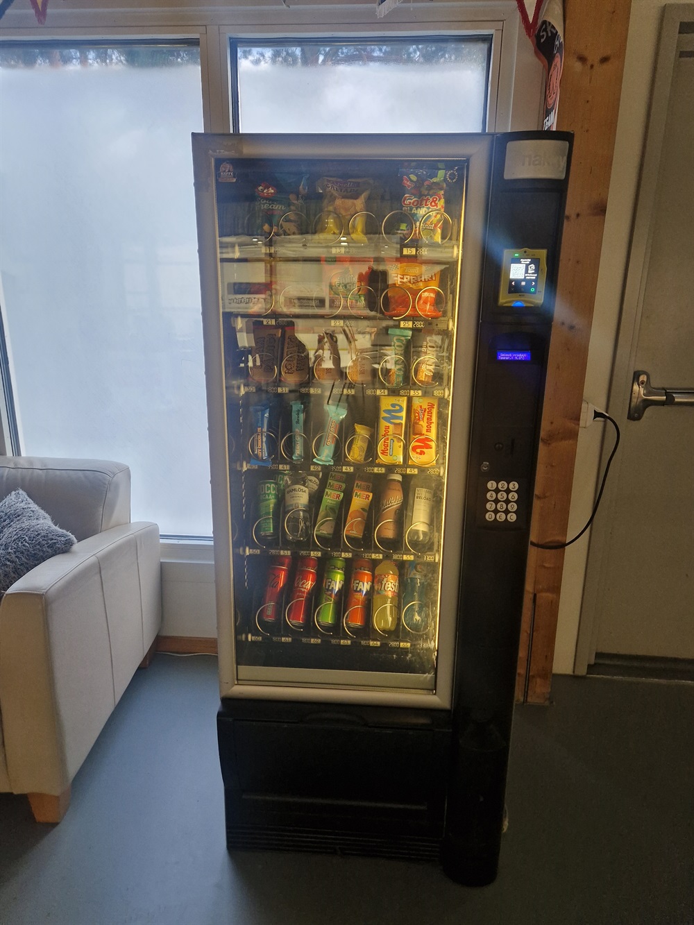 Nu har vi äntligen fått en varuautomat på plats i ishallen! Den är fylld med godsaker och dryck som ger snabb energi när det behövs – perfekt när cafeterian är stängd.