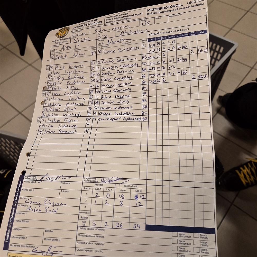 Kvällens toppstrid i 35+ inleddes med tryckt stämning i omklädningsrummet då tankarna gick tillbaka till förra årets stora Nynäsdominans i premiären och vi knappt än idag förstår hur vi fick med några pinnar ifrån den matchen. Extra spänning också då någon låst förrådet med nyckel istället för låsknappen... Ack, ve och fasa och kvällens matchförberedelser var i fara. Ända tills Peter räddade kvällen och med några vänliga ord fick vaktis att öppna. Här tar vi fint upp pennan och noterar att har man nyckel så låser man ändå med LÅS-knappen uppe till höger.
