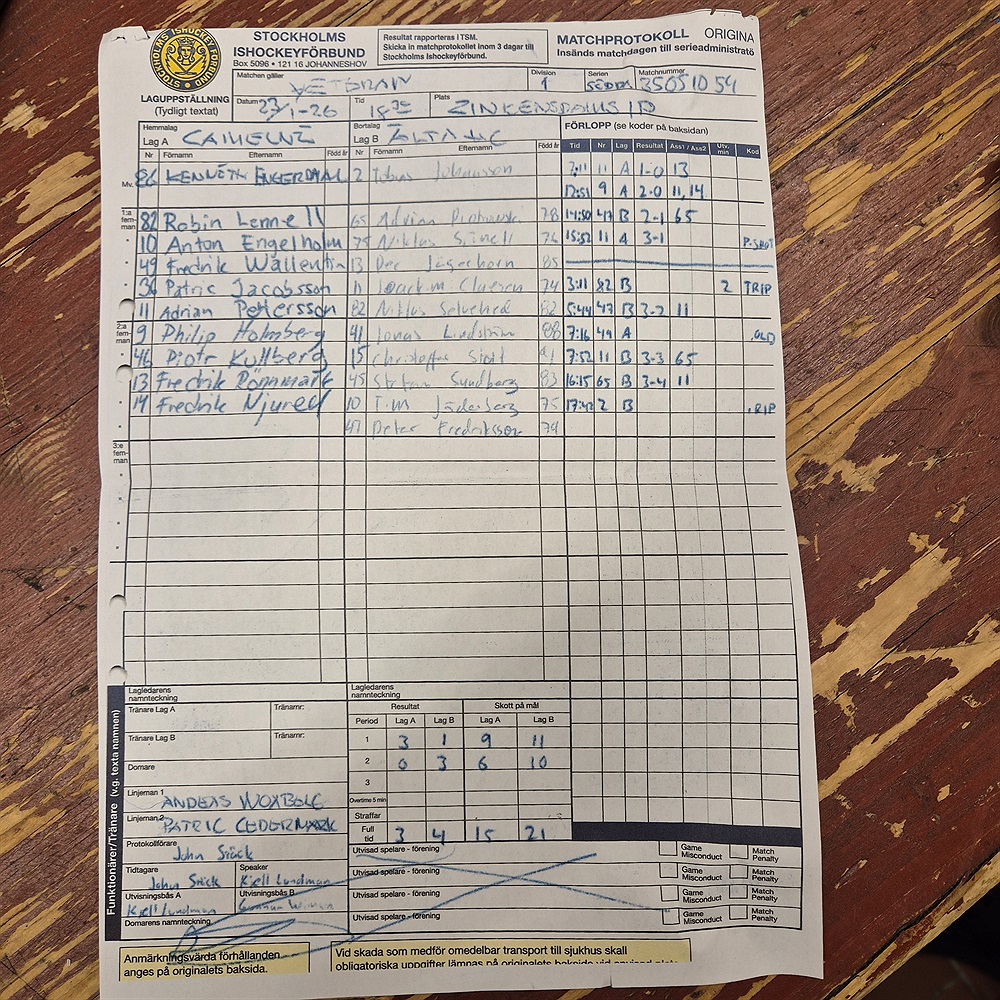 Tobbe kör lite looki-looki och trollar med knäna på frilägen, så bra att domaren tar visning på... ja, hela publiken är fortfarande förundrad... "RIP" står det i protokollet - så kanske nåt dödligt escape-trick? Boxplay är Tobbe trollkars egen leklåda så Camelen kunde inte lura in nån puck där inte...